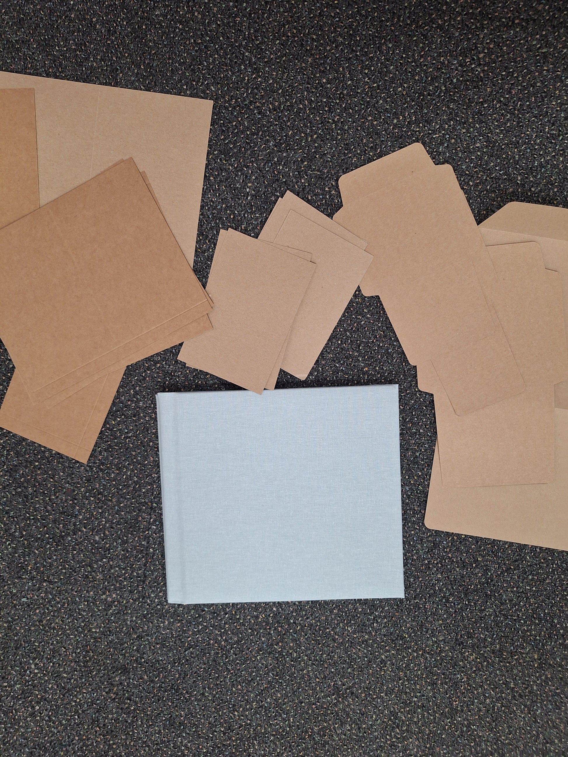 THIS ALBUM IS A THREE FOLD ( SEE ATTACHED PHOTOS) WITH EXTRA INSERTS AND ENVELOPES. INSIDE IS KRAFT WITH A TEAL LINEN OUTSIDE